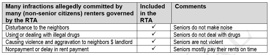 Sadly, none of the above organizations have responded to our request to comment on the alleged disparity in the Residential Tenancies Act, and our suggestion to deal with this disparity with our alternative solution of Seniors Helping Seniors by: