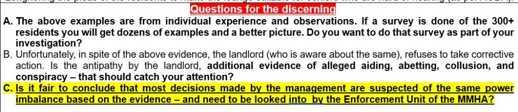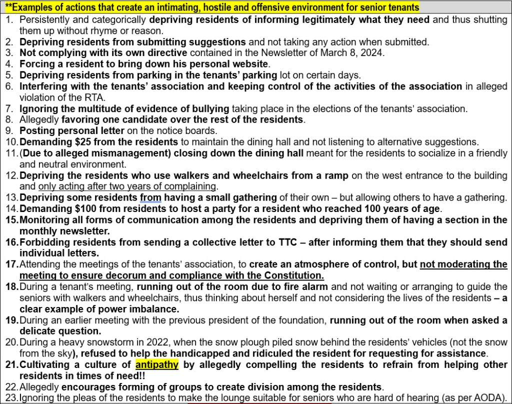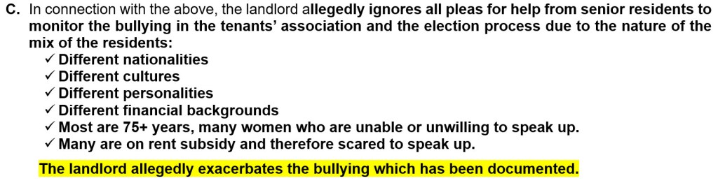 - B. Another very important fact is that many of the residents of seniors’ rental apartments, who are silent and do not participate in meetings or discussions or express their problems, are those who are on rent subsidy. They do not wish to rock the boat or express themselves lest they lose their subsidy or are evicted. They are very fearful, and this defeats the entire Mission Statement of the Landlord. On the other hand, the landlord allegedly encourages residents to apply for rent subsidy since the landlord knows that they will get their full market rent from the Government – and allegedly these residents will not open their mouths or speak against the landlord.