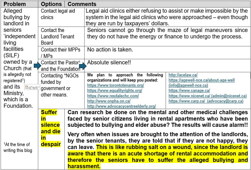 Unfortunately, some NGO’s who are funded directly or indirectly by taxpayer dollars do not even have the courtesy to respond or enter into a discussion – even though their mandate is to address the challenges faced by senior citizens. They are allegedly focused on issues which they are familiar with or where there may be monetary gains, but they do not wish to enter into a wider discussion issues facing issues of bullying of senior citizens in rental apartments.